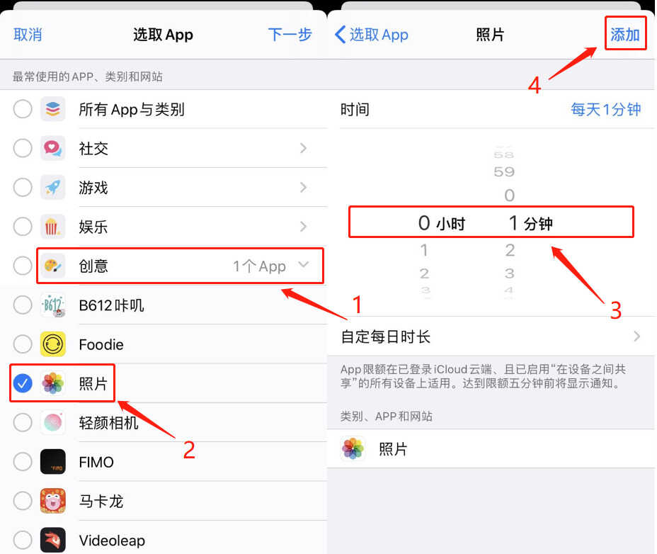 然后你只需要打开“照片” app ,浏览 1 分钟,系统就会提示时间限额已到啦。