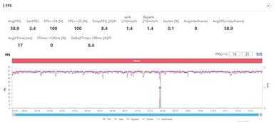在满帧60帧的《王者荣耀》游戏中,三星Galaxy A53能以59帧的平均帧率稳定运行,帧率表现十分出色,平稳的帧率曲线没有出现多余的波动,处理器性能释放的十分自如。而在游戏体验上,得益于直屏的优势,在整体的游戏过程中十分过瘾,不会发生误触等现象。此外,三星Galaxy A53还新增了游戏助推器可以在手机温度、储存空间以及续航方面做出不错的优化。