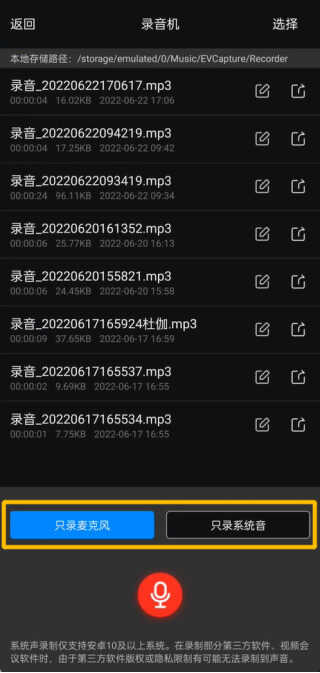 其中【系统声音录制】仅支持安卓10及以上系统。在录制部分第三方软件,视频会议软件时,由于第三分部软件版权或隐私限制可能无法录制到声音。