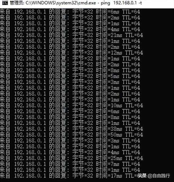 然后怀疑是电信的问题,但当电脑卡的时候,手机仍然很流畅。打开电脑的cmd,开命令行窗口:ping 192.168.0.1 -t,发现丢包严重。内网连路由都丢包,跟电信就没关系了。