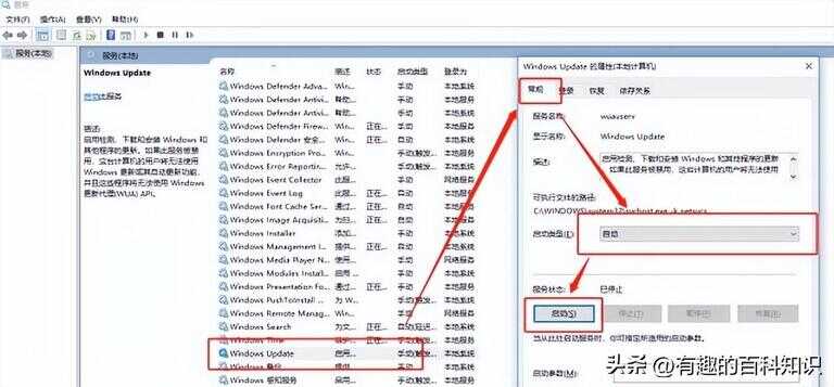 2、找到Windows Update,点击鼠标右键选中“属性”,进入“Windows Update的属性”界面,启动类型选择“自动”,服务状态选择“启动”,点击“确定”即可。