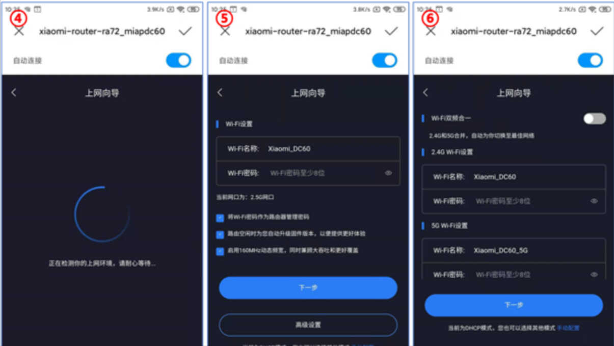 ● 如果检测到是DHCP模式则直接显示如下图⑤,Web后台管理员密码默认与WiFi密码相同。此时点击“高级设置”可以针对2.4G/5G WiFi和管理员分别设置密码,如下图⑥。