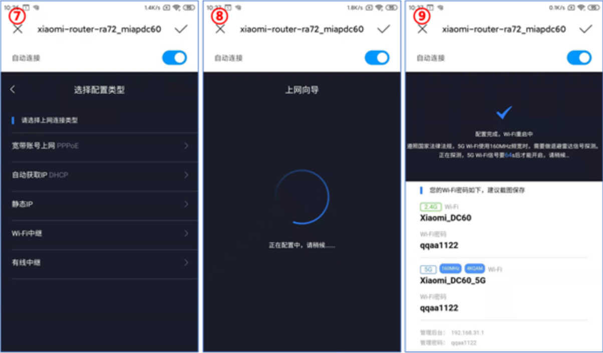 5. 设置WIFi名称和密码之后,点击“下一步”就会出现图⑧,配置成功会自动出现图⑨界面显示密码信息,至此路由器网络配置成功。此时WiFi模块会自动重启,等待显示新WiFi并连接,手机便可上网。