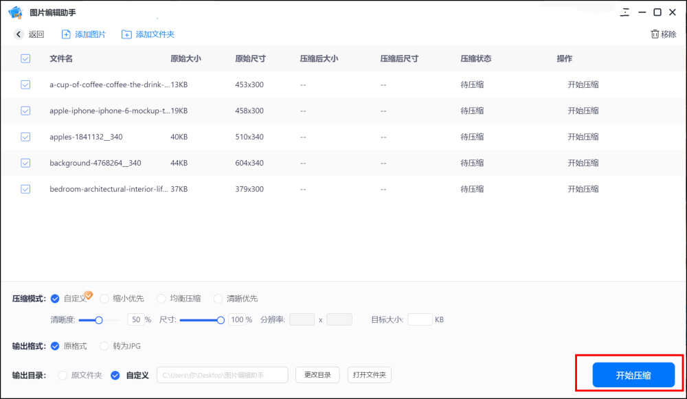 第二步,点击上传需要压缩的图片文件,上传完成之后,点击选择压缩模式以及输出格式、输出目录等选项,点击【开始压缩】,等待系统进行处理。