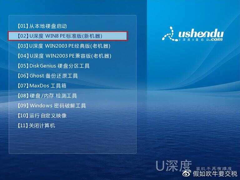 电脑进入启动项的方式不一样大家根据自己的电脑百度一下就知道怎么进入启动项设置界面了进入pe系统后我们选择第一个选项老旧电脑可选择第二个选项进入桌面后点击u深度一键装机整则u盘里的系统文件整则安装系统的位置点确定
