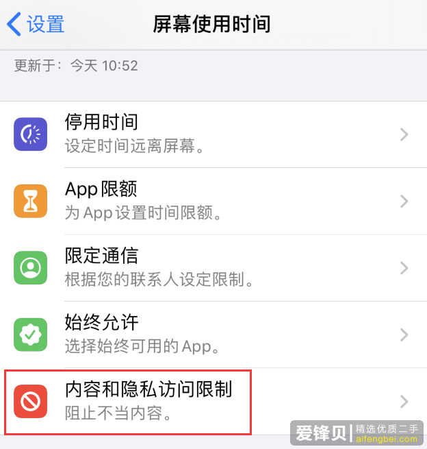 解决办法,打开iPhone的“设置”-“屏幕使用时间”-“内容和隐私访问限制”: