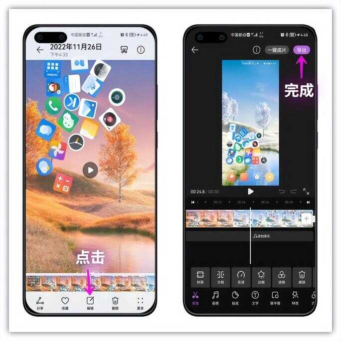 录屏结束后,视频会自动保存在手机相册,点击【编辑】,可以裁剪分割视频,以及剪辑视频。