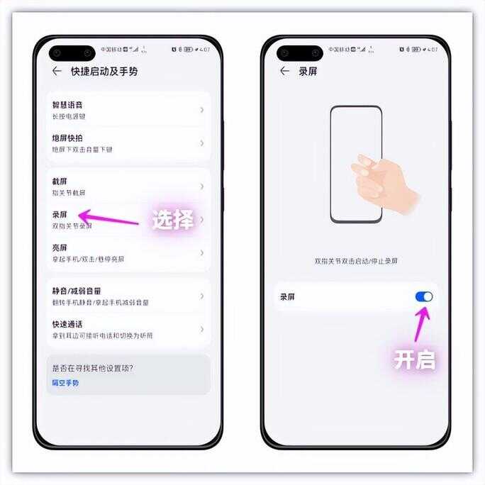 然后点击【录屏】选项,进入后开启录屏功能,这样我们就可以利用双指关节进行录屏了。