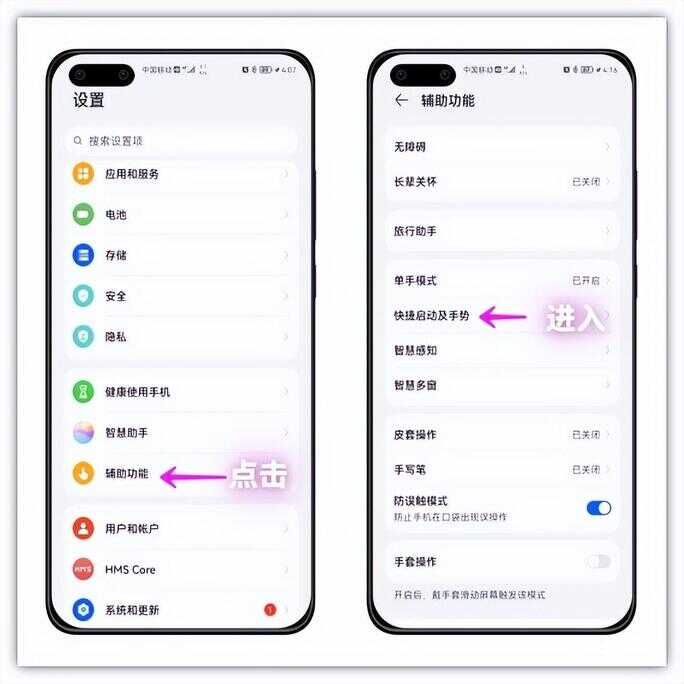首先我们打开华为手机的【设置】,下滑找到【辅助功能】,进入后点击【快捷启用及手势】。