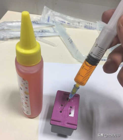 找到对应墨水颜色的注墨孔,将注射器针头浅浅插入注墨孔中,缓慢推动注射器注入,