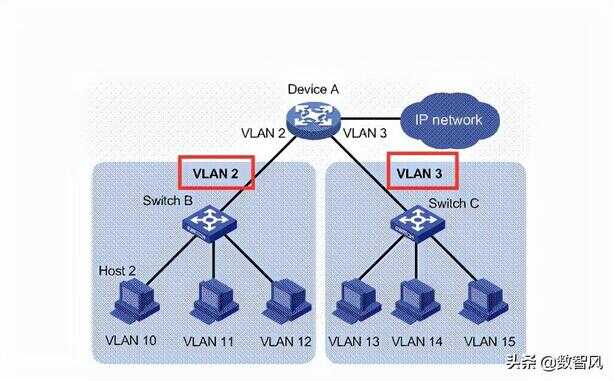 - VLAN之间按需开通互相访问,一般情况下通过三层交换机转发。