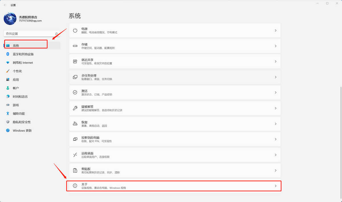 2、点击系统后,在打开的界面左侧选择栏移动到最下面,我们可以看到 “关于” 选择,点击它;