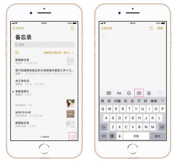 首先打开苹果手机自带的备忘录,点击右下角的笔记按钮,进入内容编辑界面,然后再点击键盘上方的照相机按钮。