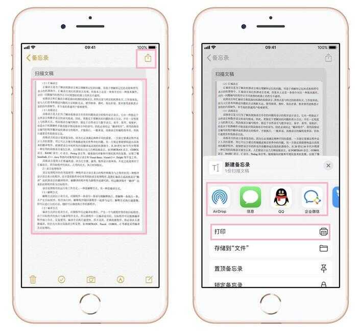最后可以看到,纸质文档被扫描到备忘录中了,而且是PDF电子文档,点击右上角的分享按钮,可以选择打印和发送。