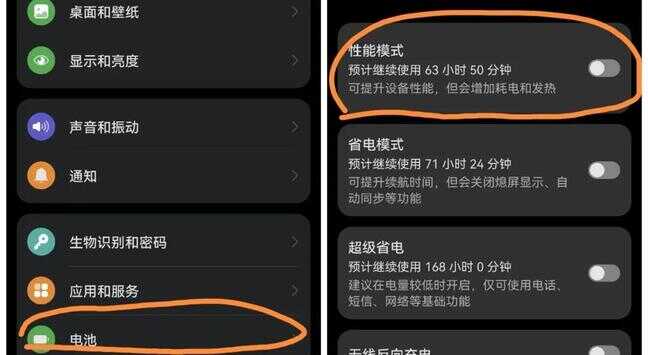 返回到设置界面,选择电池点开,找到性能模式,把性能模式打开就行了。