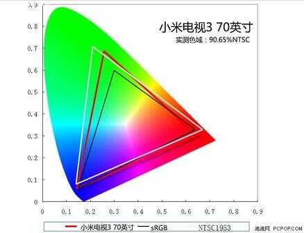 实测结果显示,小米电视3 70英寸的色域标注值偏向于保守,我们这台测试机在最高亮度、开启背光调节以及标准图像模式的默认设置下,色域值高达90.65%NTSC,这无疑最对它可显示颜色范围的正面肯定,在入门电视还停留在74%NTSC的时代背景下,小米电视3 70英寸做到了入门价的广色域,相信但从色域来看,只有量子点背光机型才有可能超越它的性能了。