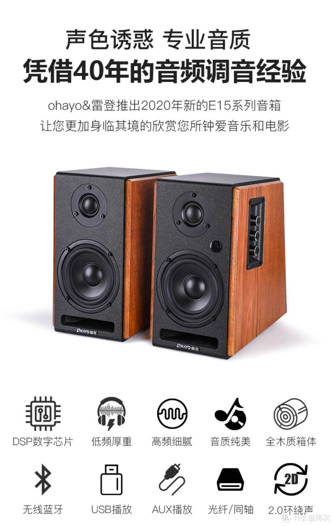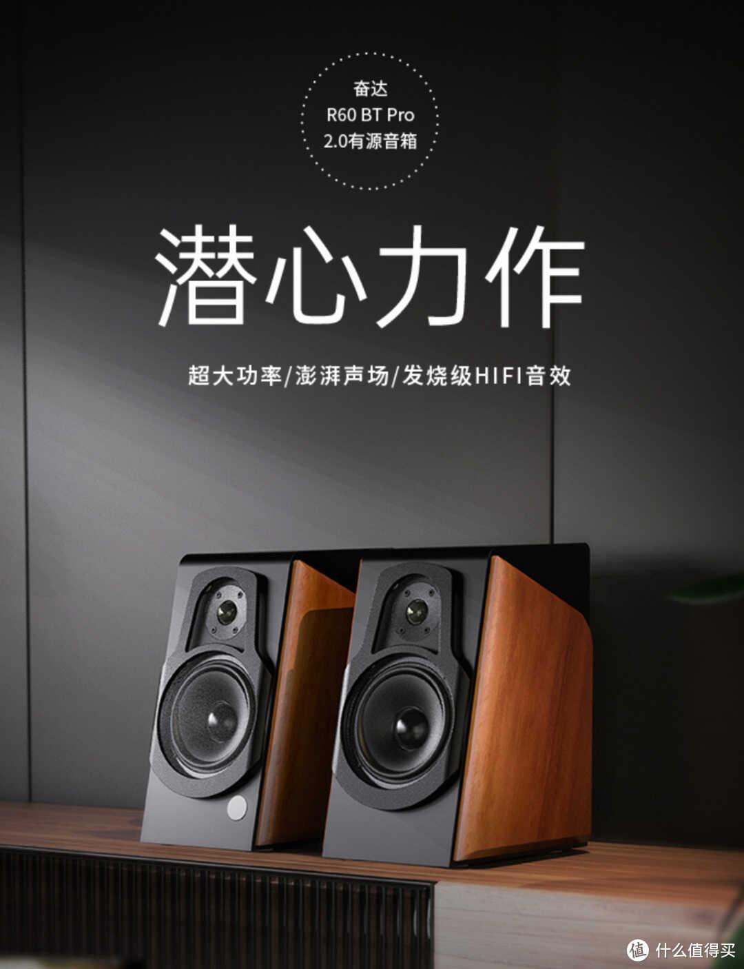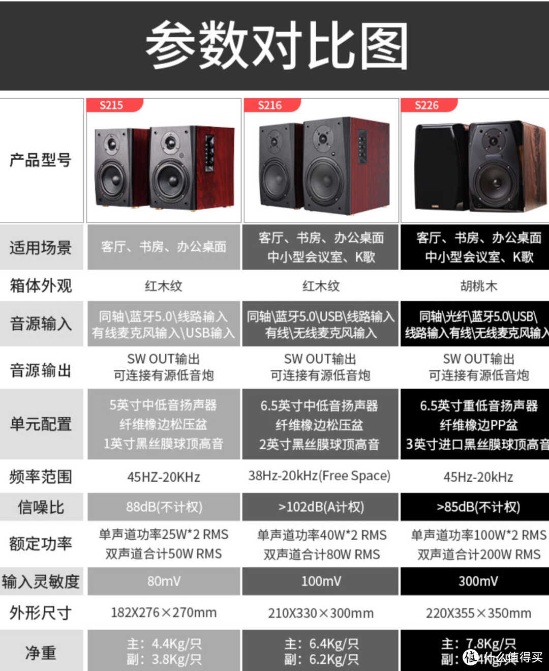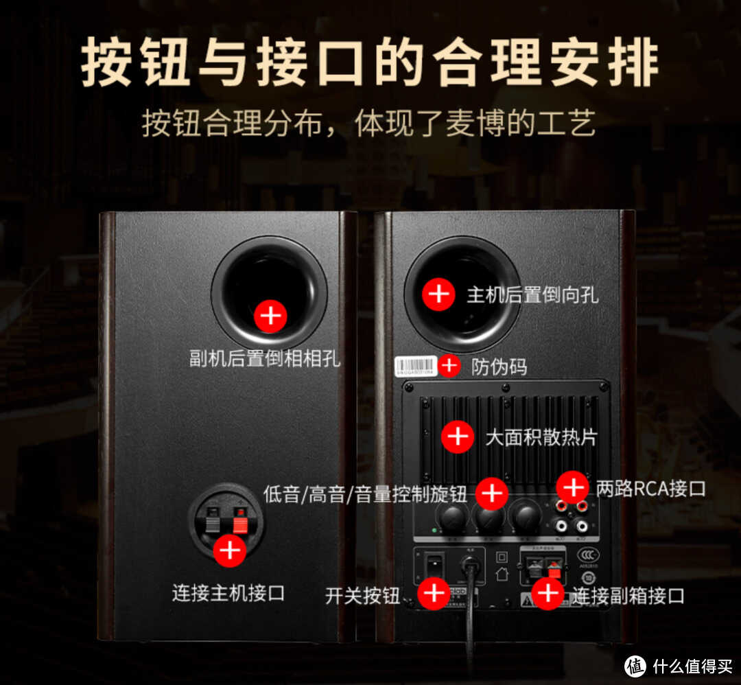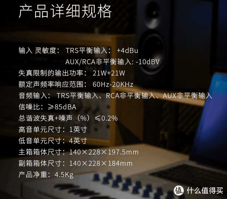 这是一款5英寸中低音单元+25mm高音2分频的2.0音箱。尺寸:W174× H289 × D252 ,净重:9.72公斤,适合1.4米以上的电脑桌使用,小客厅也同样适用。