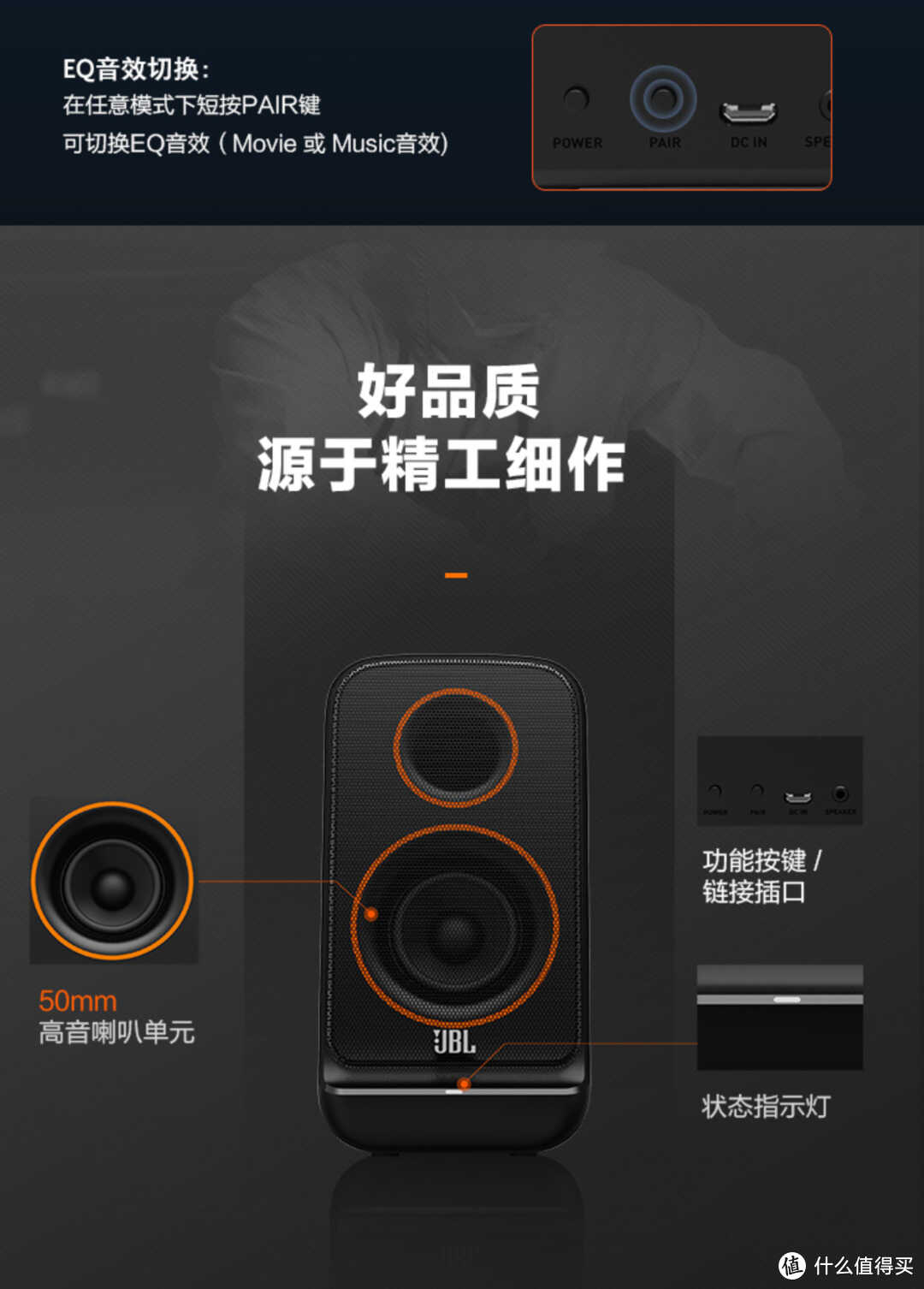 50mm全频扬声器,电影/音乐两种预设EQ模式