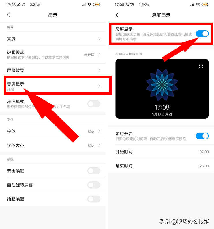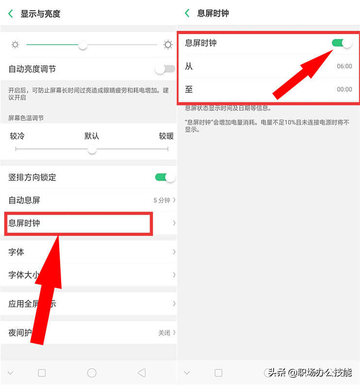 这个功能在OPPO手机里叫做“息屏时钟”,开启方式也是大同小异。先打开手机【设置】,然后点击进入【显示与亮度】,再点击【息屏时钟】,最后设置好显示时间就可以了。值得一提的是,它在电量不足10%时会自动关闭该功能。