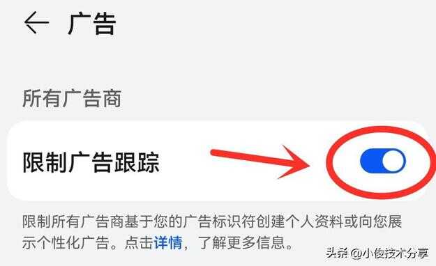 在设置中把【广告】开关点击打开,然后把【限制广告跟踪】开关打开就可以了,打开广告限制跟踪开关,就能有效减少手机给我们推荐的广告了!
