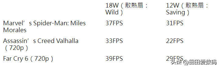 先比较一下在 3A 大作上的游戏流畅度,包括《Marvel’s Spider-Man: Miles Morales》《Assassin’s Creed Valhalla》,这些游戏在 12W 与 18W 时的流畅度区别。我们可看到这类游戏的表现分别颇大。但如果玩图像在中上水平的《Far Cry 6》,即使在散热扇在 Saving 水平,而且在 12W 供电输出下,都可有 29fps 的流畅度。