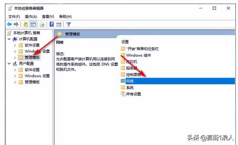 2、进到后选择“管理模板“”,点击“网络”。