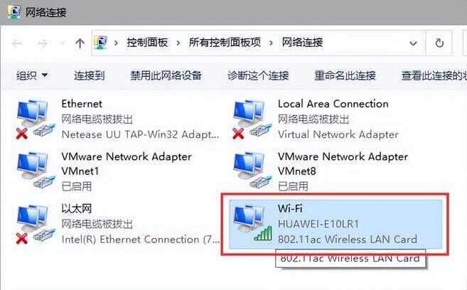 3、找到电脑选择使用的网卡,如果电脑连接了网线,网卡名称一般为【本地连接】或者【以太网】,如使用的WiFi,则选择【WiFi】或者【WLAN】;