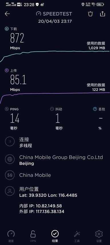 Speedtest实测vivo S6 下载速度达到872Mbps 上传达到85.1Mbps
