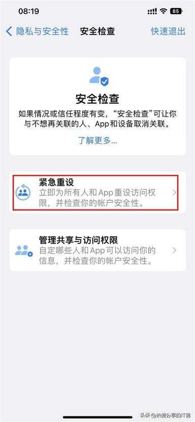 3、在“安全检查”设置界面轻点“紧急重设”,此时iPhone将通过面容 ID、触控 ID 或你的密码来验证你的身份,验证通过后才能进入“紧急重设”设置界面。