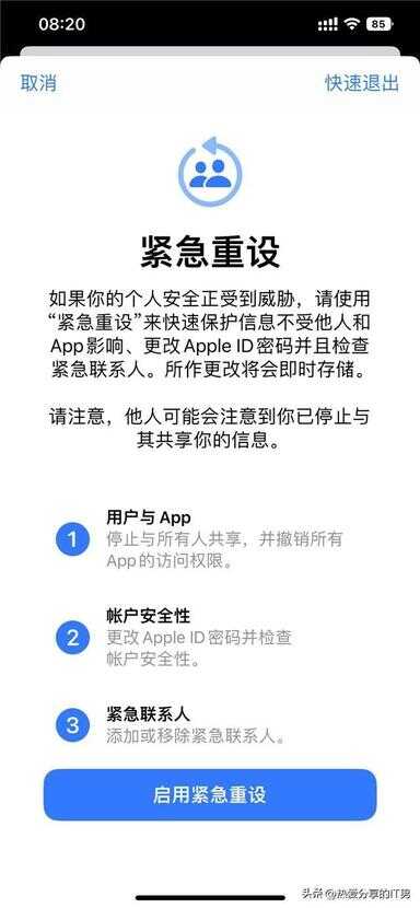 4、在“紧急重设”设置界面,轻点“启用紧急重设”,按系统指引依次进行停止共享、更改Apple ID密码和添加/移除紧急联系人三项操作。