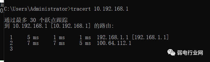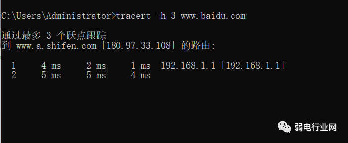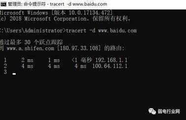例4、“tracert -h 3 baidu.com”代表本次tracert搜索的最大跳数,输入3表示搜索在路由器跳转3次,如下图所示: