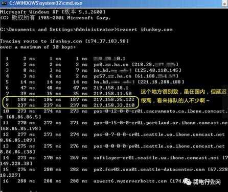 上图是在网络畅通无误,DNS解析正确的情况下 tracert ifunkey.com 的结果。恩,路上有点堵车,延迟有点高,(这个地方的带宽使用比大,或者有人下载或看电影),而且当我走到第8和第9条街的时候,耽搁了不少时间,因为在堵车,但最终还是成功的走出了第8和第九条街。