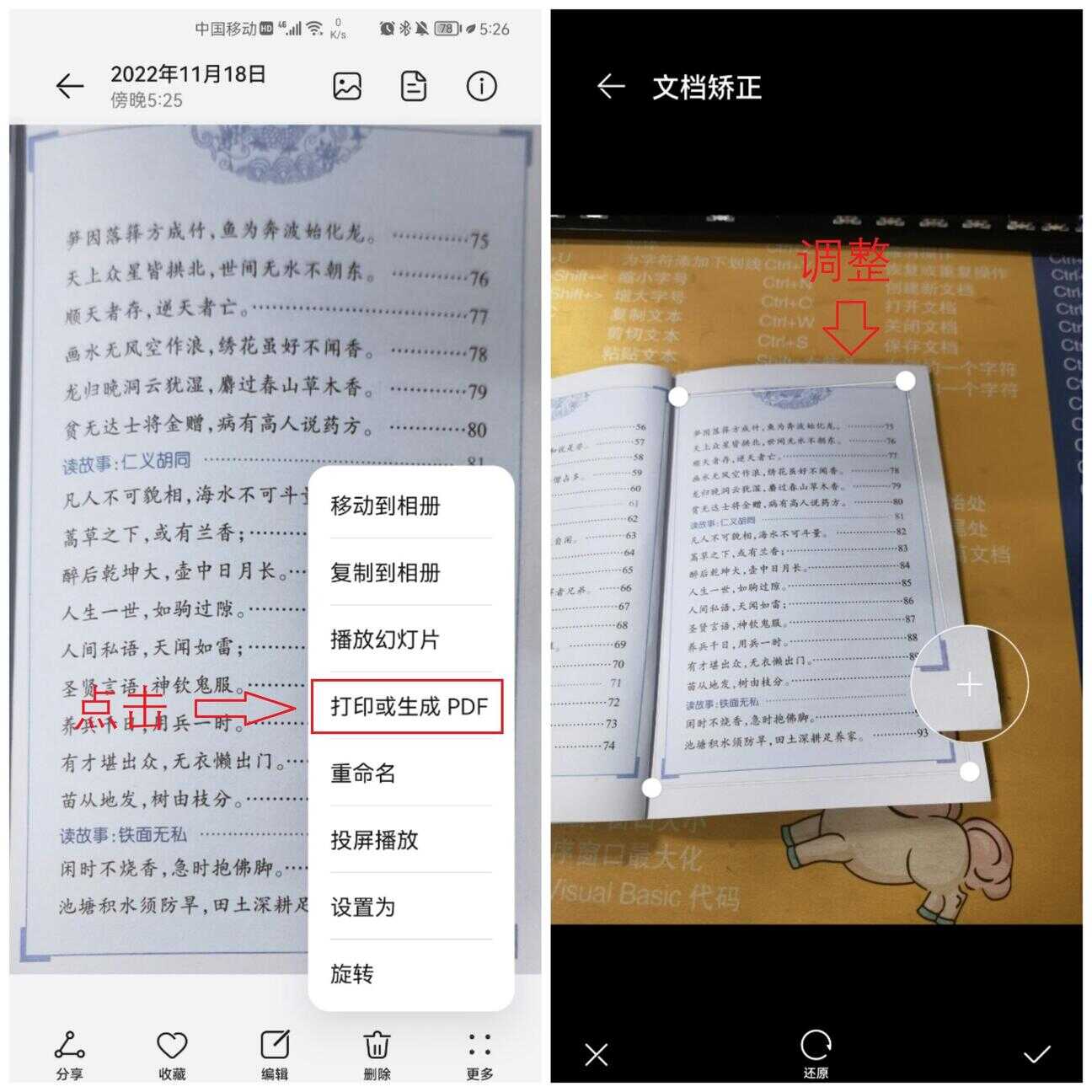 这样拍出来的文稿非常规范,不含任何杂边阴影,手抖也没关系,支持手动调整文档范围。点击右下角的【更多】,还能打印或生成PDF文件。