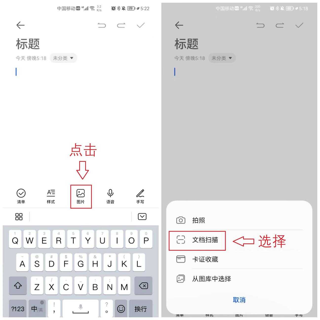 华为手机的备忘录也有扫描识别功能,需要新建一个笔记,然后点击【图片】,选择【文档扫描】功能,支持对图片、纸质文稿进行扫描识别。