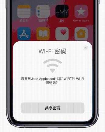 3.当另一台 iPhone 搜索并接入同一个 WiFi 网络时,已连接该 WiFi 的手机会弹出卡片对话框询问是否要分享 WiFi 密码,这时只需要点击分享,对方的手机就能自动接入该 WiFi 且无需输入密码。