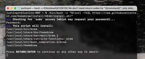您将被告知 Homebrew 将对您的系统进行的每项更改,并要求您再次按 Enter。如果您还没有安装 Apple 的命令行工具,您可能需要安装它。如果是这样,此过程也将为您自动执行 - 只需按照说明操作即可。