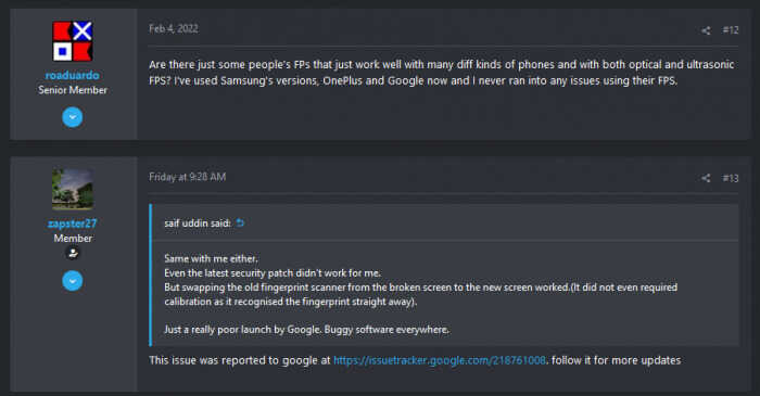 在 Reddit 社区和 Google Support 的帖子中,一些 Pixel 6 系列用户表示在更换显示屏后无法使用他们的 Pixel 6(和 6 Pro)的指纹传感器。即使这些换屏是在那些由 Google 官方认可的服务店(例如 UBreakIFix)修复的,依然存在这样的问题。即使是那些应该能够维修 Google Pixels 的技术人员,也不能让这个工具每次都能发挥作用。