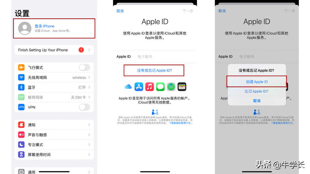 如果在设置新iPhone时,没有进行Apple ID的注册,也可在设置中AppleID登录界面直接注册。