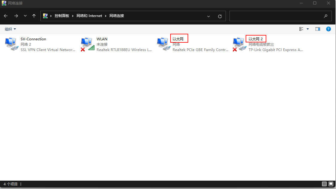 注意:上面用红色字体的部分是需要你修改的部分。其中蓝色字体"本地连接"一般不需要修改,这要看你的电脑中“控制面板--》网络和Internet--》网络和共享中心”,窗口中的连接名而定,一般的只有一个“本地连接”,如下图中红框中显示的这台电脑就不是“本地连接”,而是“以太网”和“以太网 2”。