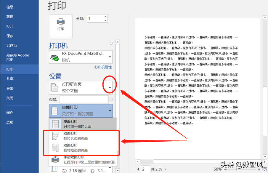 3、在打印设置页面,点击“单面打印”旁边的下拉按钮。下拉菜单中有两个双面打印选项。如果文档是竖向页面,建议选“双面打印-翻转长边”这个选项。如果文档是横向页面,建议选择“双面打印-翻转短边”选项。