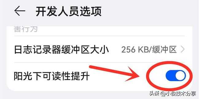这个时候,我们同样只需在【开发人员选项】把【阳光下可读性提升】这个开关打开,打开之后,手机在阳光下就会自动调整可读性,我们在阳光下就不会看不清手机屏幕了!