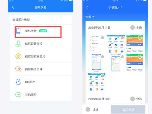 在首页找到图片恢复功能,然后选择手机图片,系统会自动对手机进行扫描,扫描结束后即可看见删除的照片。