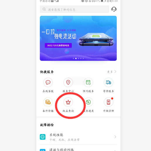 首先在华为手机桌面找到“服务”应用,在里面找到【权益查询】并点击它;