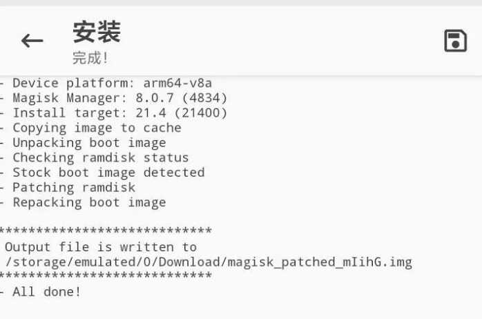④ 打开已经安装好的Magisk Manager,首先选择设置-更新通道,更改为测试版;然后回到主页面,选择安装-选择修补一个文件-找到并选择你刚提取的boot.img文件,安装后出现以下界面表示成功了