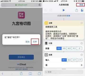 二、使用自带的 Safari浏览器,打开复制好的九宫格切图网址 ,然后点击下方的「获取捷径」,然后在“捷径”中打开,提示中,点击「打开」,之后再点击右上角的「完成」,完成安装,如下图所示。