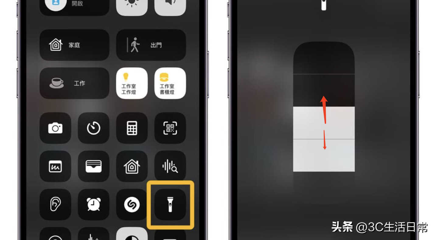 下滑控制中心,长按“手电筒”,就可以调节手电筒的亮度。