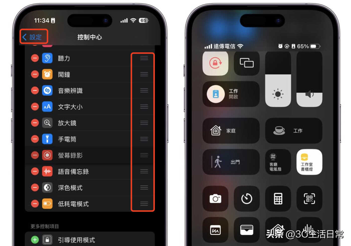 1、左侧的增减按键是用来自定义要加入或删除控制中心的功能。
