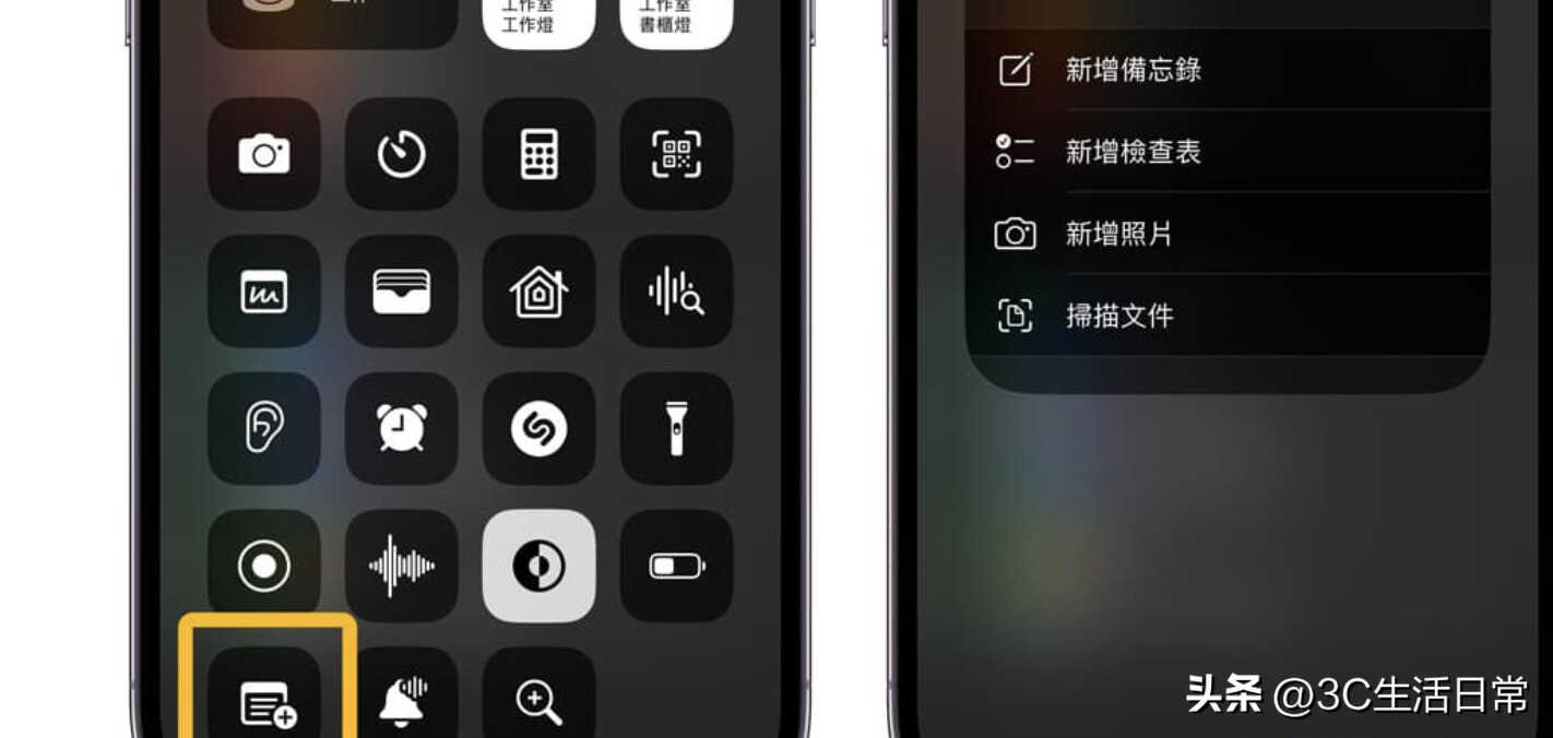 打开“设置”,点击“控制中心”,添加“备忘录”,下滑“控制中心”,长按“备忘录”,点击“扫描文件”就可以快速扫描文件。