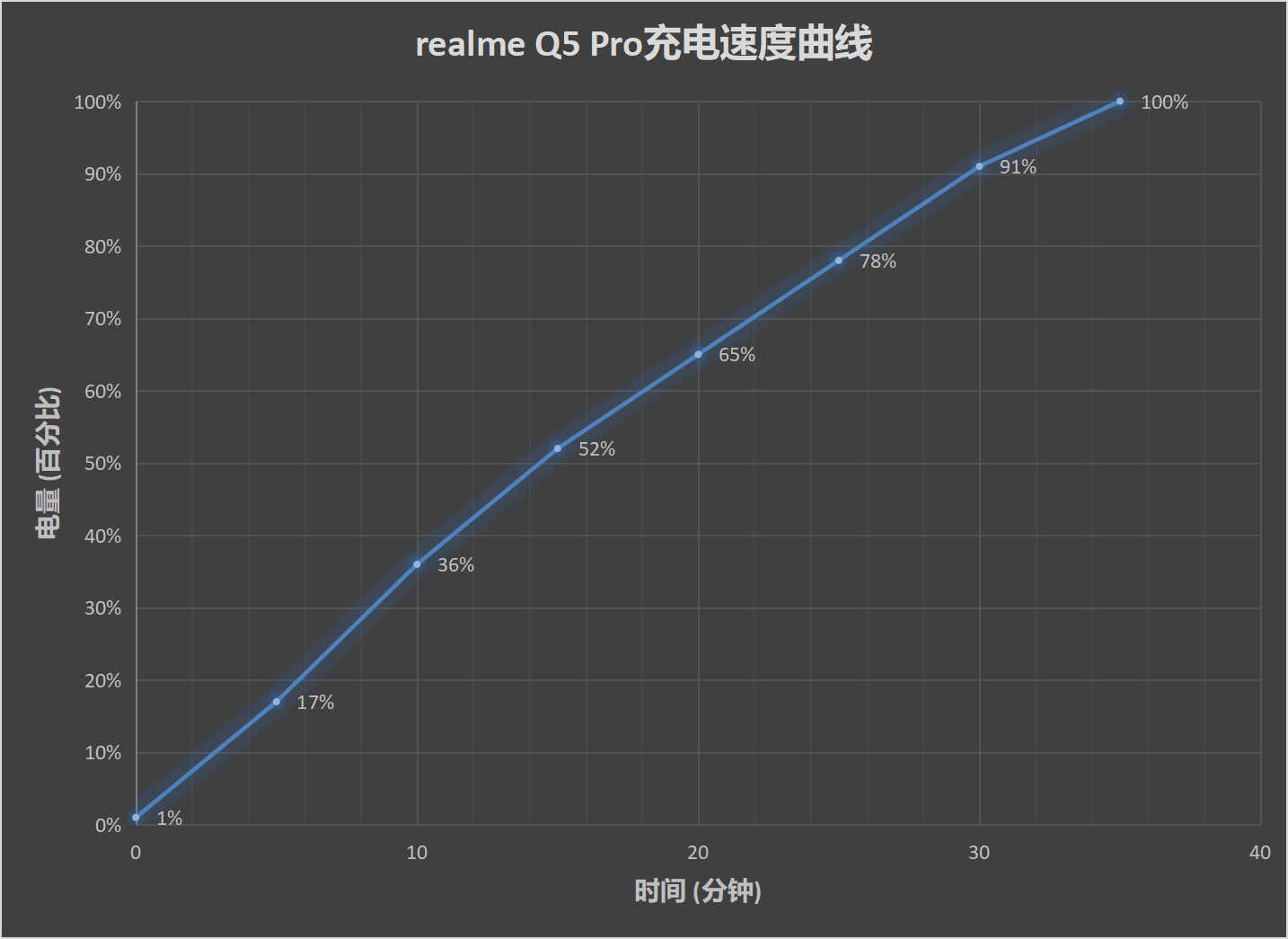 其中10分钟可充入36%,20分钟可充入65%,对于5000mAh的大容量电池来讲,这个成绩也已经非常不错了。
