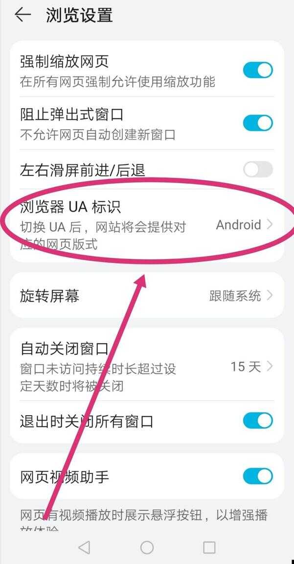 (4)在浏览设置页面里面,点击“浏览器UA标识”选项。